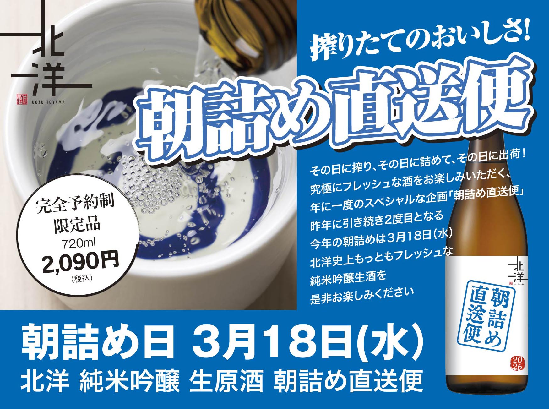 【限定商品のご案内】3月18日(水)北洋 純米吟醸 無濾過生原酒 朝詰め直送便